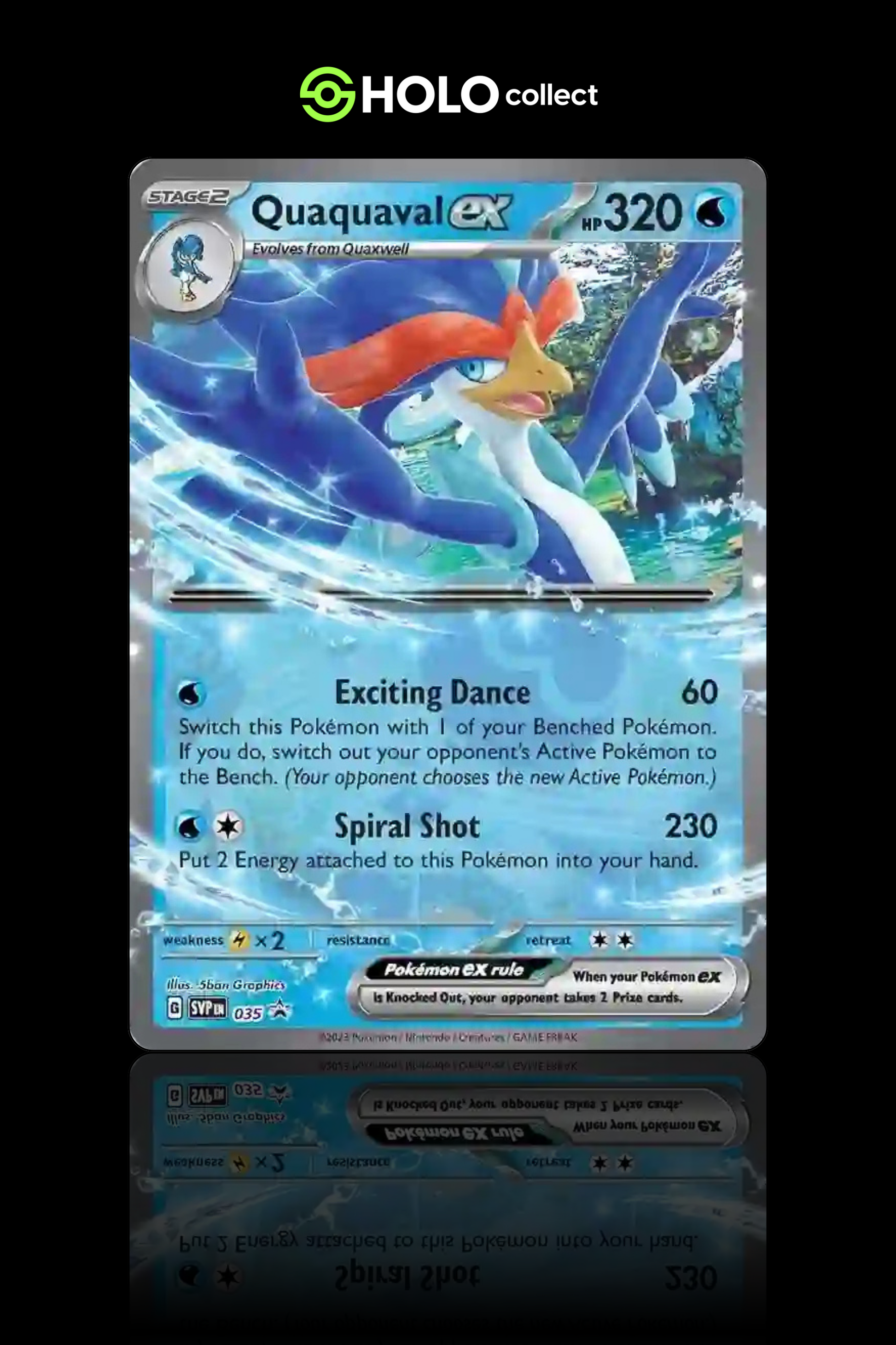 Quaquaval ex strikes a flamboyant pose mid-dance, surrounded by spiraling jets of water and stylized energy trails. The bold aquatic color palette and rhythmic motion design showcase its flair and strength. As part of the Scarlet & Violet Promo line, this card is a must-have for collectors who love vivid, performance-based art.